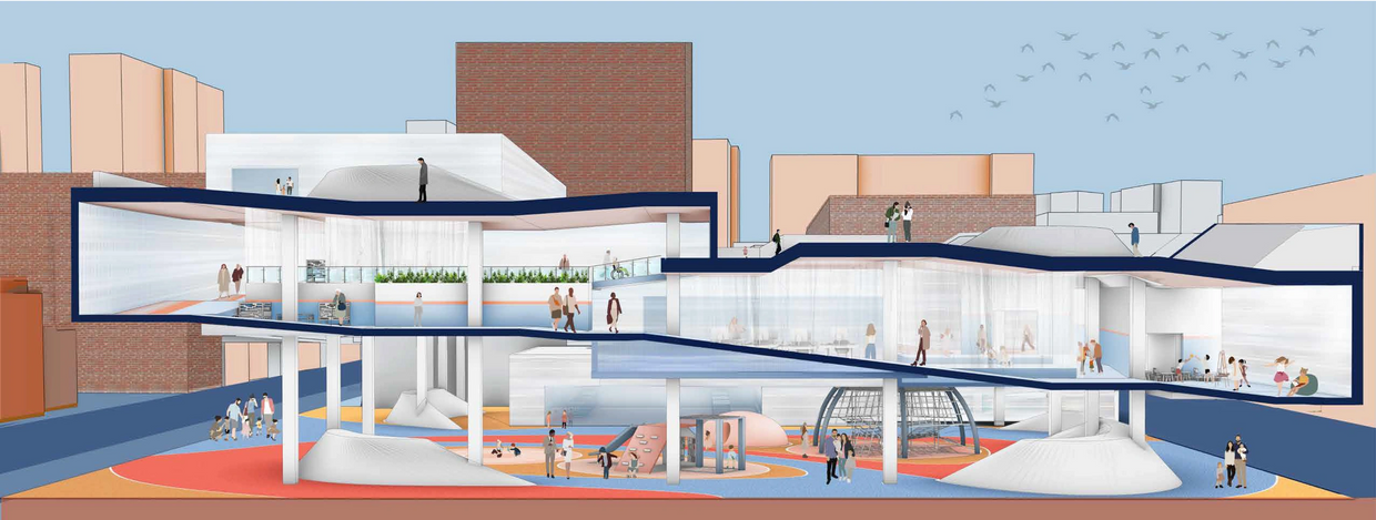In addition to providing space for public labor, this building uses ramps as the space organizer to divide the space into six floors for convenience. The design of the ramp also provides convenience for mothers who need to take care of children and the elderly, and makes the space safer.